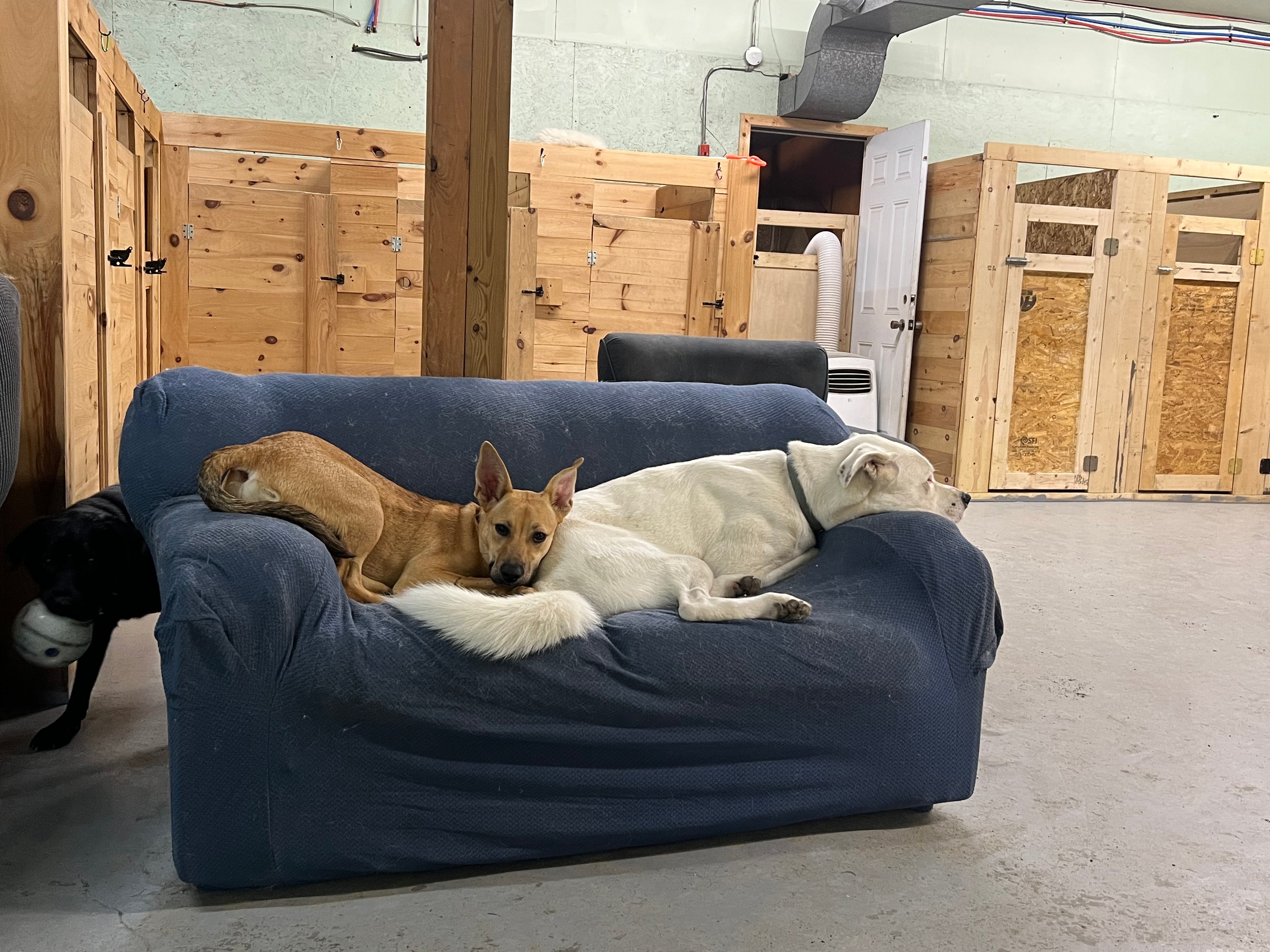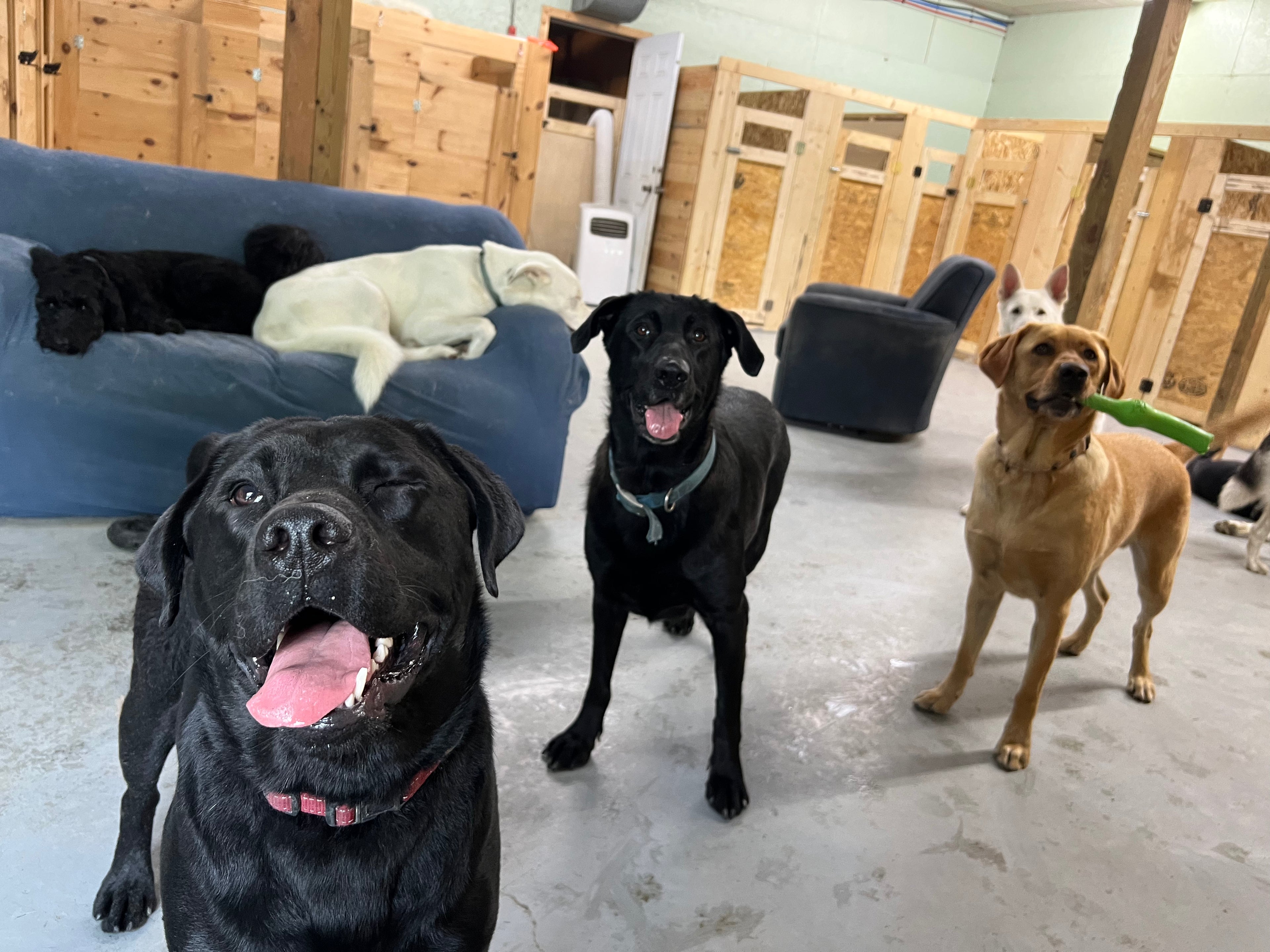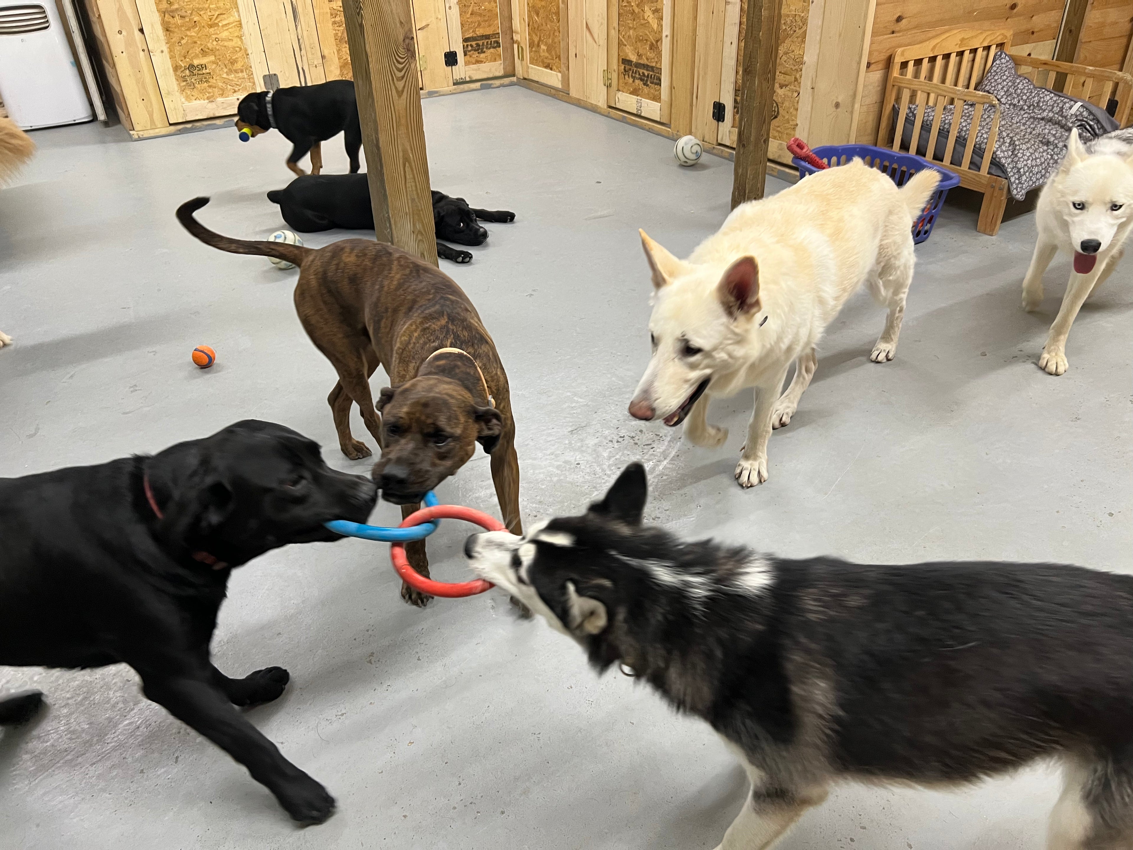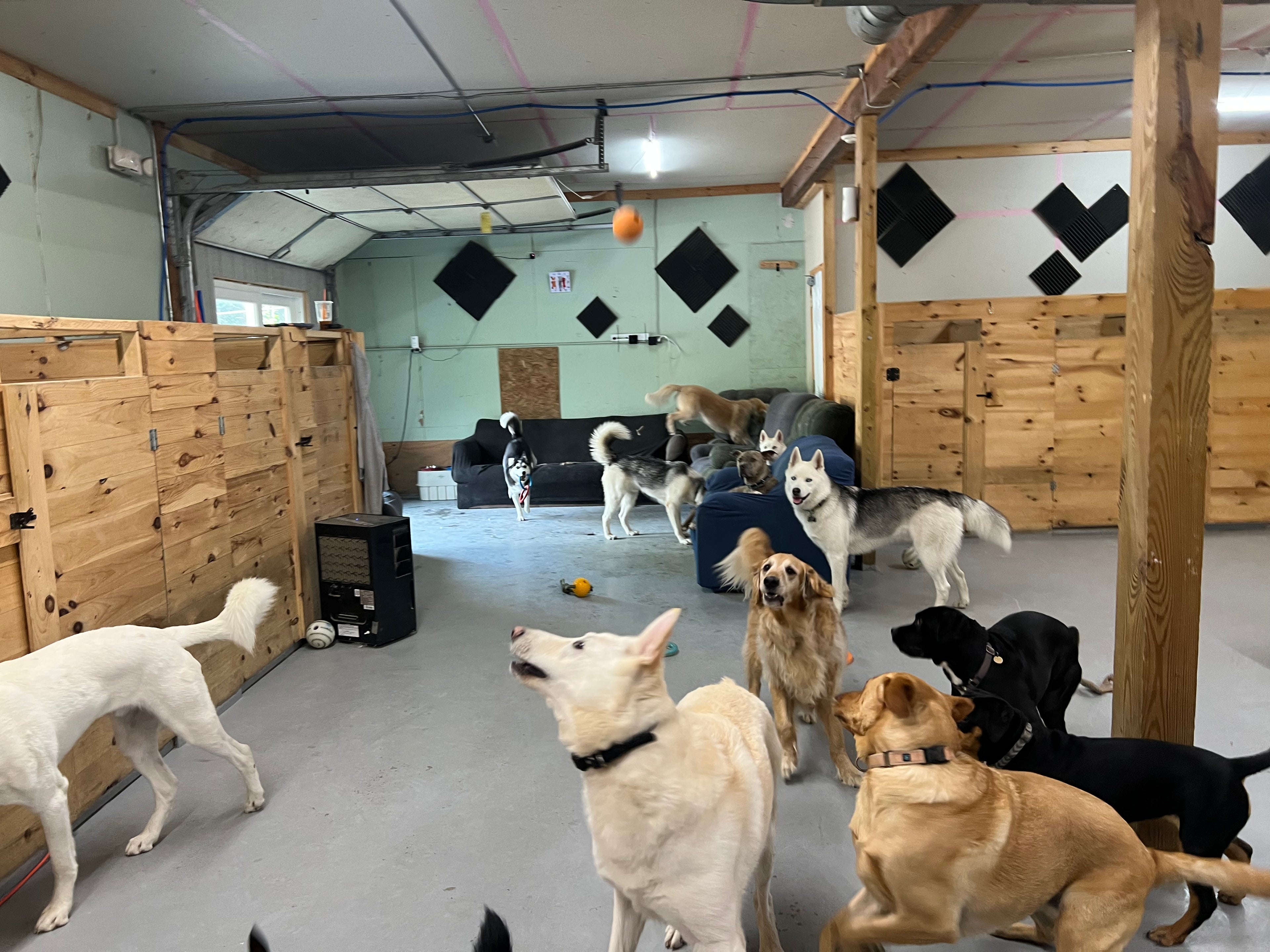 Here at 4 The Love of Dogs Day Care and Boarding, we take great pride in our crate-free facility. Our doggie daycare family spend the day playing together as a pack. Our daycare facility is comprised of several open-top wooden rooms with lots of open indoor play space and a large, fenced-in and monitored outdoor play area. Dogs spend very little time in their rooms which are used for primarily for feeding and "time-outs."